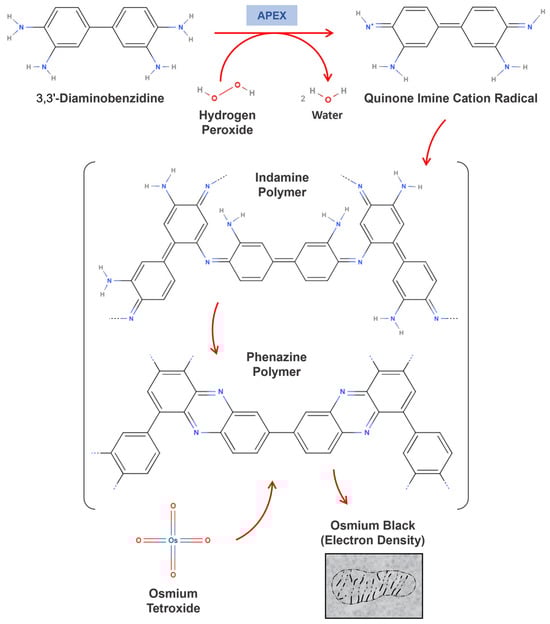 In 2012, Alice Ting’s group introduced a genetically engineered version of APX, derived from Glycine max, as a reporter for electron microscopy (EM) applications [12]. This innovative approach engineered APEX (E for engineered) to catalyze the oxidation of 3,3’-Diaminobenzidine (DAB) in the presence of hydrogen peroxide, initiating a polymerization reaction that produces indamine or phenazine products that form an insoluble brown precipitate. These products, upon forming complexes with osmium tetroxide, enable high-resolution imaging with an exceptional contrast (Figure 3) [65,66,67,68,69].