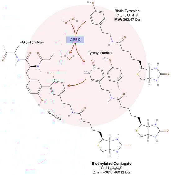 Concerning proteome applications, engineered APEX mediates the oxidation of the most common substrate, biotin-tyramide (also known as biotin–phenol), in the presence of hydrogen peroxide. This reaction generates biotin–phenoxyl radicals, which covalently bind to electron-rich amino acids, including tyrosine, tryptophan, and cysteine [12,70]. These radicals exhibit a high reactivity, a short lifespan of <1 ms, and a limited tagging radius, initially estimated at approximately 20 nm [70]; however, recent evidence indicates a broader diffusion radius of 269 ± 41 nm [91]. Proteins labeled through this approach are purified using streptavidin-conjugated resin and identified by a liquid chromatography tandem mass spectrometry analysis (LC-MS/MS) [14,92]. This technique is advantageous because it bypasses dependencies on protein–protein interactions or organelle integrity post-labeling, enabling the precise mapping of protein interactomes (Figure 5).
