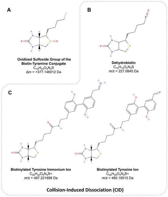 The structure of biotin derivatives. (A) The variation in the oxidized sulfoxide group of biotin-tyramide, resulting in a mass shift of +377.146012 Da. (B) The m/z value of 227.0845 corresponds to dehydrobiotin, a product ion specific to biotin. (C) The m/z values of 497.221698 (immonium ion) and 480.19515 (immonium-related ion) represent characteristic ions associated with biotinylated tyrosine.