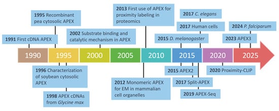 Enhanced variants of APX (APEX) have further improved the labeling specificity, efficiency, and cellular targeting, enabling the detailed mapping of biomolecular interactions across subcellular compartments [14,15]. The utility of APEX extends beyond proteomics, offering significant advantages in mapping specific cell compartments and studying protein interactomes, cellular structures, and subcellular processes in living cells. These advancements underscore APEX’s versatility and potential to drive deeper insights into molecular mechanisms. This review provides a comprehensive analysis of APEX technology, detailing its structural and functional attributes, engineering advancements, and applications in proteomic and transcriptomic studies. Additionally, we explore the latest innovations in APEX-based labeling strategies, addressing current limitations and potential future directions.