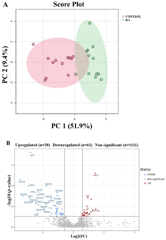 An additional univariate analysis using the MetaboAnalyst software package (MetaboAnalyst version 6.0, McGill University, Montreal, QC, Canada; http://www.metaboanalyst.ca, access date 10 September 2024) was conducted, where the data were further normalized via log transformation and Pareto scaling. The significant and dysregulated proteins in this study were further analyzed using PCA (Figure 2A) and a volcano plot, in which the x- and y-axis indicate the fold change (cutoff > 1.5) and the y-axis t-test (FDR p < 0.05), respectively (Figure 2B). This rigorous analysis combining the expression fold change and FDR-corrected p-value (FDRp) showed that only 28 and 61 proteins were up- and downregulated in the RA patients compared with the control patients, respectively. The spots showing a statistical significance between the two conditions were then manually excised from the preparative gel for protein identification by MALDI TOF-MS.