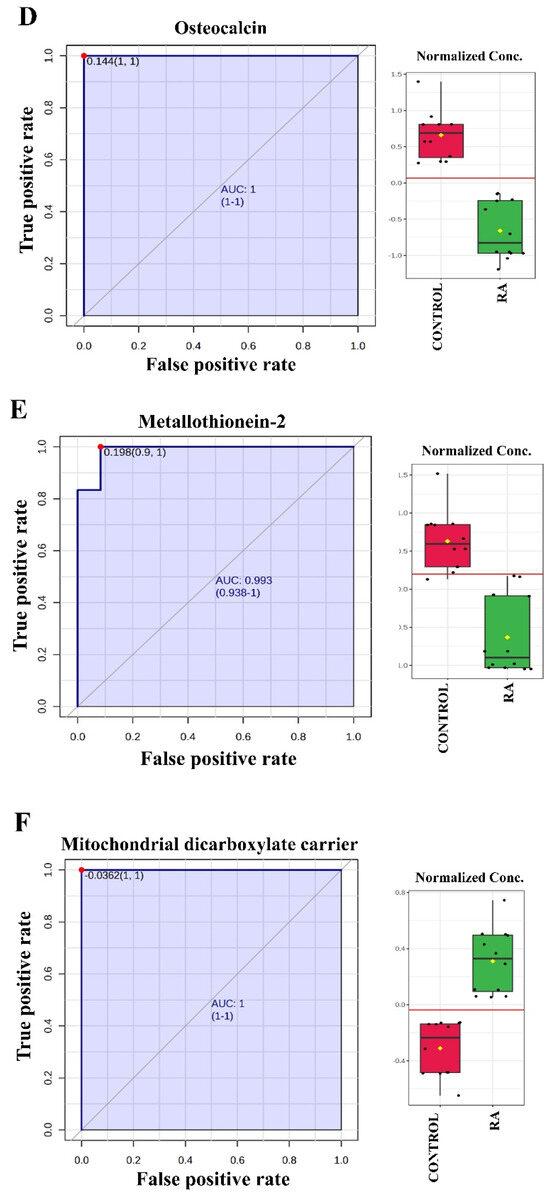 We further analyzed the proteins using multivariate exploratory ROC analysis based on the identified common and significantly dysregulated proteins between the RA and control (n = 69) groups. The ROC curves were generated using PLS-DA as a classification and feature ranking method. The highest AUC of the exploratory ROC curve for a model with three proteins was 0.984 (Figure 5A). The frequency plot of the top 13 significantly dysregulated identified protein biomarkers in the RA and control groups showed that coiled-coil domain-containing protein 124, osteocalcin (OC), metallothionein-2, muskelin, etc., were downregulated in the RA group (Figure 5B). Four proteins showing the highest AUCs are shown, namely coiled-coil domain-containing protein 124 (AUC of 1, Figure 5C), OC (AUC of 1, Figure 5D), metallothionein-2 (AUC of 0.933, Figure 5E), and mitochondrial dicarboxylate carrier (AUC of 1, Figure 5F).