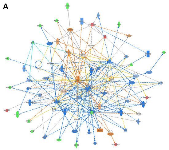 The significant DAPs identified between the RA and control groups in our study were uploaded into the IPA software. IPA maps the proteins in our dataset to known proteins and their biological pathways. The DAPs were mapped to three major network pathways. The network with the highest score (score = 37) showed that these proteins were focused around the dysregulation of STAT1, TNF, and IL4 signaling pathways and were related to cell-to-cell signaling and interaction, hematological system development and function, and immune cell trafficking with a score of 37. The top canonical pathways identified were related to LXR/RXR activation (p-value of 2.76 × 10−9 and overlap of 5.7%, 7/122), the DHCR24 signaling pathway (p-value of 7.60 × 10−9 and overlap of 5.0%, 7/141), acute-phase response signaling (p-value of 4.79 × 10−8 and overlap of 3.8%, 7/184), response to elevated platelet cytosolic Ca2+ (p-value of 2.00 × 10−7 and overlap of 4.4%, 6/136), and binding and uptake of ligands by scavenger receptors (p-value of 2.25 × 10−6 and overlap of 4.4%, 5/113) (Figure 6A,B).