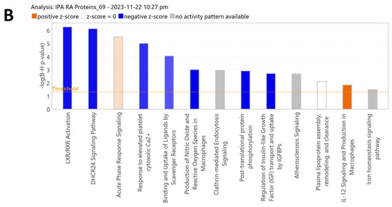 Network and biological pathway analysis relating to the significantly identified proteins in the study. (A) Network pathway analysis of the significantly dysregulated proteins identified in the RA group compared to the control group revealed dysregulation in pathways related to cell-to-cell signaling and interaction, hematological system development and function, and immune cell trafficking. The pathway identified TNF and IFNG as the central nodes. (B) The top canonical pathways related to the DAPs were LXR/RXR activation, DHCR24 signaling pathway, acute-phase response signaling, and response to elevated platelet cytosolic Ca2+ and IL-12 signaling. The blue color indicates an inhibition, while the orange color indicates an activation of these pathways between the RA and control groups.