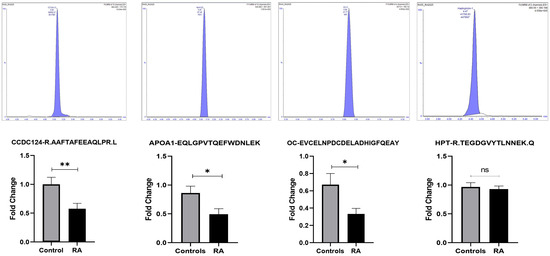 Multiple reaction monitoring (MRM) mass spectrometry for validating study findings. The MRM method based on signature peptides was developed to validate the expression of four proteins, namely CCDC124, Apo-A1, OC, and HPT, found in the proteomics approach (2D-DIGE MALDI-TOF-MS). The top panel shows representative MRM chromatograms of selected peptides asterisk (*) indicates the extrapolated concentration value. The bottom panel shows expression of these four proteins preesnted as fold changes between the RA and control groups. Statistical significance was evaluated using an unpaired t-test (n = 120), in which * represents p ≤ 0.05, ** represents p ≤ 0.01 and ns represent non-significant.