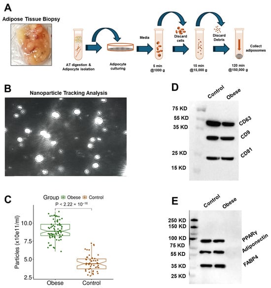 Adipose tissue biopsies were processed using previously established protocols [12]. Briefly, freshly excised visceral adipose tissue was rinsed with sterile Medium 199 (Gibco, Waltham, MA, USA), minced into small fragments, and subjected to enzymatic digestion in a solution containing Type I collagenase (Worthington) and 4% bovine serum albumin (BSA) (catalog no. A2153, Millipore Sigma, Rockville, MD, USA) in Medium 199. The resulting cell suspension was filtered and centrifuged at 500× g to isolate mature adipocytes from the floating layer. Isolated adipocytes were transferred onto membrane inserts (Corning® 24 mm Transwell® with 0.4 µm Pore Polyester Membrane Insert, Sterile, catalog no. 3450, Life Sciences, Huntsville, AL, USA) and cultured in Medium 199 supplemented with 5% exosome-depleted fetal bovine serum (FBS, catalog no. A2720801; ThermoFisher Scientific, Waltham, MA, USA) and 1% penicillin-streptomycin. After 24–48 h of incubation, the conditioned medium was collected and processed by sequential centrifugation, initially at 1000× g for 5 min and then at 15,000× g for 15 min. The supernatant was filtered through a 0.45 µm membrane and ultracentrifuged at 150,000× g for 2 h to pellet adiposomes. The adiposome pellet was resuspended and characterized using a Nanoparticle Tracking Analyzer (NanoSight NS300; Malvern Instruments, Malvern, UK).