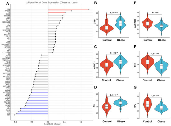 To further resolve and rank the abundance patterns of significantly altered proteins, a lollipop plot was generated (Figure 3A) displaying log2 fold changes (FDR < 0.05), stratified by both the direction and magnitude of change. Among the upregulated proteins, C-reactive protein (CRP; Figure 3B) showed the greatest increase in obese individuals (fold change = 2.23), consistent with its established role as an inflammatory biomarker associated with metabolic dysfunction and cardiovascular disease. Apolipoprotein C-1 (APOC1; Figure 3C) and Complement C9 (C9; Figure 3D) were also significantly elevated (fold change = 1.94 and 1.84, respectively), indicating potential alterations in lipid metabolism and immune response within obese adipose tissue.