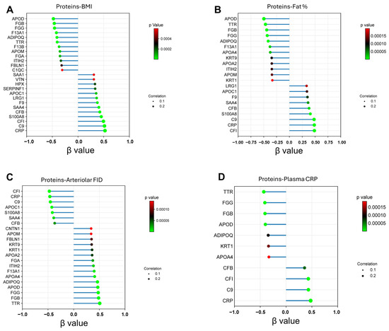 Complementing these findings, a parallel pattern was observed among several downregulated adiposome proteins, which appeared to play protective roles. The reduced abundance of proteins such as TTR, ADIPOQ, FGB, and FGG was consistently associated with adverse clinical features. These proteins showed negative associations with visceral fat, leptin, the leptin/adiponectin ratio, and circulating IL-6 levels while exhibiting positive correlations with brachial artery flow-mediated dilation, a marker of vascular health. The directionality of these associations suggests that their downregulation in obesity may contribute directly to endothelial dysfunction, immune dysregulation, and elevated leptin levels. Additional details are provided in Supplementary Table S1.