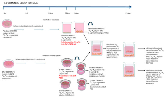 Schematic representation of experimental design employed SILAC in Co-culture Experiment. Co-cultures were maintained in conditioned SILAC medium until Day 21 to permit bidirectional molecular exchange. Samples were collected at two time points: (i) time zero, including the conditioned medium from ET-eMSCs (T0MSC) and supernatant from myofibroblasts (T0Myo), and (ii) after 48 h of co-culture, collecting the PGE2-conditioned medium containing myofibroblast and ET-eMSC secretions(48H-PGE2) and control group (48H-SPGE2). Each sample was analyzed in triplicate. (Figure created with BioRender.com, accessed on 14 November 2024).