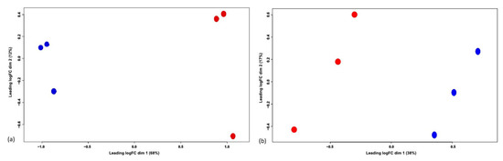 Principal Component Analysis (PCA) of the proteomic profiles. (a) PCA of the secretome of ET-eMSC samples shows a clear separation between the 0 h (blue) and 48 h (red) conditions, highlighting distinct biological differences after preconditioning with PGE2. (b) PCA of the proteome of myofibroblast samples also demonstrates separation between 0 h (blue) and 48 h (red) conditions, indicating proteomic changes induced by the co-culture.