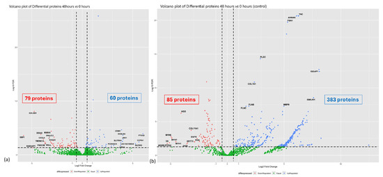A total of 3861 quantifiable proteins that matched the database were detected in the myofibroblast samples, and 1410 proteins in the secretome of ET-eMSC samples. In the myofibroblasts, 139 proteins showed significant differential abundance when comparing the proteome at 0 h and the proteome at 48 h of co-culture with ET-eMSC. Among these, 79 proteins decreased in abundance (logFC < −0.5, FDR < 0.05), while 60 proteins were increased in abundance (logFC > 0.5, FDR < 0.05), as visualized in the volcano plot diagram in Figure 4a.