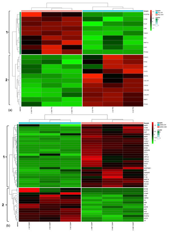 The heatmap (Figure 5b) presents the analysis of differentially abundant proteins in secretome samples from ET-eMSC preconditioned with PGE2 (eMSC.0H) and after 48 h of co-culture with myofibroblasts (eMSC.48H). Hierarchical clustering revealed two distinct clusters, with high-abundance proteins displayed in red and low-abundance proteins in green.