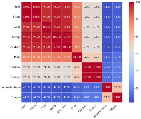 Figure 11 shows the SASA values of heme calculated for ten species representing three categories: livestock (beef, bison, sheep, goat, and red deer), pork, poultry (chicken and turkey), and fish (yellowfin tuna and tilapia).