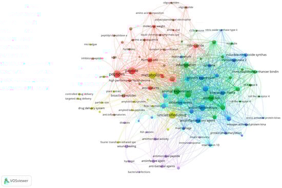 Bibliometric network analysis of recent publications (2020–2025) using VOSviewer (version 1.6.20), based on Scopus data. Clusters reveal thematic areas most relevant to marine bioactive peptides and inflammation.