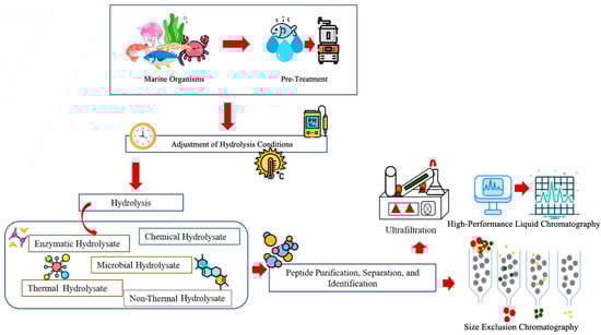 Protein hydrolysis is the process of cleaving large protein molecules into low-molecular-weight peptides or individual amino acids, involving a molecule of water for each broken bond [67]. Nowadays, marine organisms and their by-products, especially those derived from fish, are widely recognized as a significant source of proteins, minerals, and fatty acids. On average, the value of fish by-products reaches a content of 49.22–57.92% proteins. Several methods, such as enzymatic, chemical, microbial, thermal, and non-thermal hydrolysic, are involved in the formation of protein hydrolysate [68]. Following protein hydrolysis, products are subjected to purification, separation, and peptide or amino acid identification (Figure 4). Enzyme hydrolysation is a highly efficient method in comparison to other methods, and uses several enzymes such as pepsin, trypsin, neutrase, and protease while maintaining concentration, temperature, and pH [34,69].