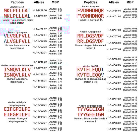 A total of 19 peptides from 10 Aedes aegypti salivary proteins bound with high affinity to MHC-I alleles associated with autoimmunity, matching peptides from 14 human proteins. The highest frequency of matches was found for aldehyde dehydrogenase, which had ten matches involving nine different alleles, while ficolin, angiopoietin, and α-glucosidase had six matches each involving six alleles each (Table 8). Since the length of peptides that bind MHC-I molecules is short, we limited our analysis for octamers and nonamers and extended the octamers by one amino acid. Thus, all matches were either identical or had only one non-identical amino acid, as illustrated in Figure 2 and shown in the total identical matches in Table 8 (22 of 43, 51.2%).