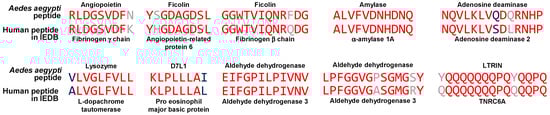 Sequences shared between Aedes Aegypti salivary proteins and human proteins were entered into the Immune Epitope Database (IEDB) search tool (https://www.iedb.org/ (accessed on 15 September 2025)) set to BLAST—70% and restricted to positive assays. Peptides resulting from this search that originated from the same human protein that shared a sequence with the corresponding Aedes aegypti salivary protein were chosen. To identify matched peptides between Aedes aegypti and human proteins, sequences were aligned at the start of the shared sequence present in the IEDB human peptide, and the sequence of the Aedes aegypti protein was extended until a peptide of the same size was obtained. A match was defined by the following conditions: at least 85% identity between the peptides and at least seven continuous amino acids from the identical shared sequence in both peptides. Each bioinformatic analysis described was run one time.