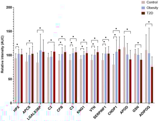 DAPs after Mann–Whitney U-tests followed by FDR correction (*: q < 0.01) in TMT labeled samples. The figure shows the mean values of the relative intensities of DAPs and their standard deviations. Pink colored bars represent the Control group, blue bars indicate the Obesity group, while red bars designate the T2D group.