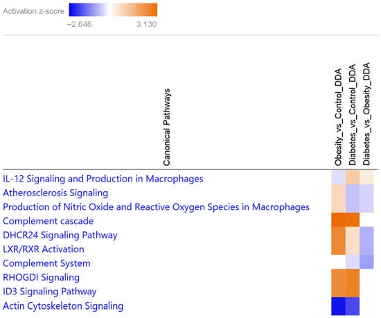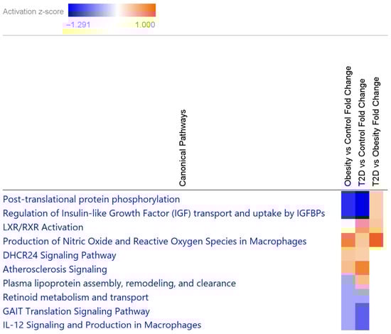 Heatmap of the top 10 canonical pathways characteristic of obesity or T2D from DAPs by IPA. Increased and decreased pathways are represented as orange or blue boxes, respectively, based on their activation z-score (scale on top). Canonical pathways with no activation are indicated with white boxes.