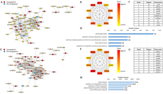 Differentially abundant AMPs from our DIA and TMT experiments (Supplementary Table S5) were supplemented with our previous Olink data [62] to generate PPI networks (Figure 4). A core network with two clusters and two separate small clusters was observed in the case of obesity (Figure 4A). One of the core clusters contains several upregulated proteins having a role in heme homeostasis, antioxidant activity and the initiation of blood coagulation, while two downregulated proteins were involved in protease inhibition. The other cluster contained mainly apolipoproteins, which are involved in lipoprotein homeostasis. They have a central place in the network, many of them being among the top 10 proteins with the highest number of interactions (Figure 4B,C). The enriched biological functions (Figure 4D) highlighted the importance of these proteins. Specifically, they took part in lipid metabolism-related functions and functions engaged in inflammatory responses and complement activation.