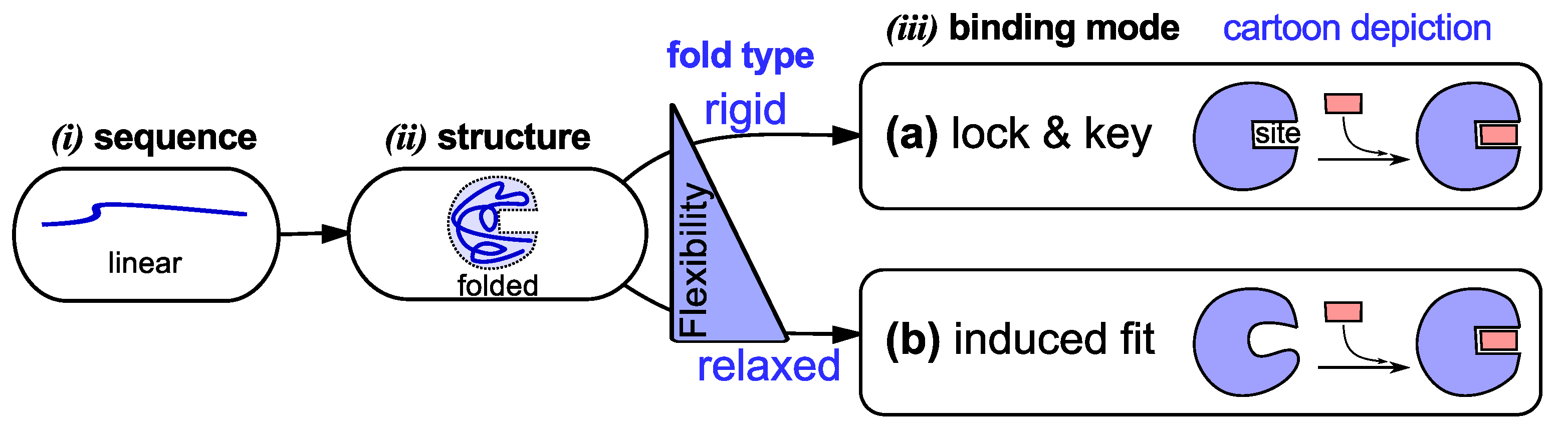 Traditional models of protein structure and function (via binding). In the textbook picture, a linear protein sequence of specific amino acids (i) folds into a specific structure or fold (i). That fold then binds to its partner by either of two modes (“lock and key” [33,34] or “induced fit” [35]) depending on the fold’s flexibility/rigidity (iii).