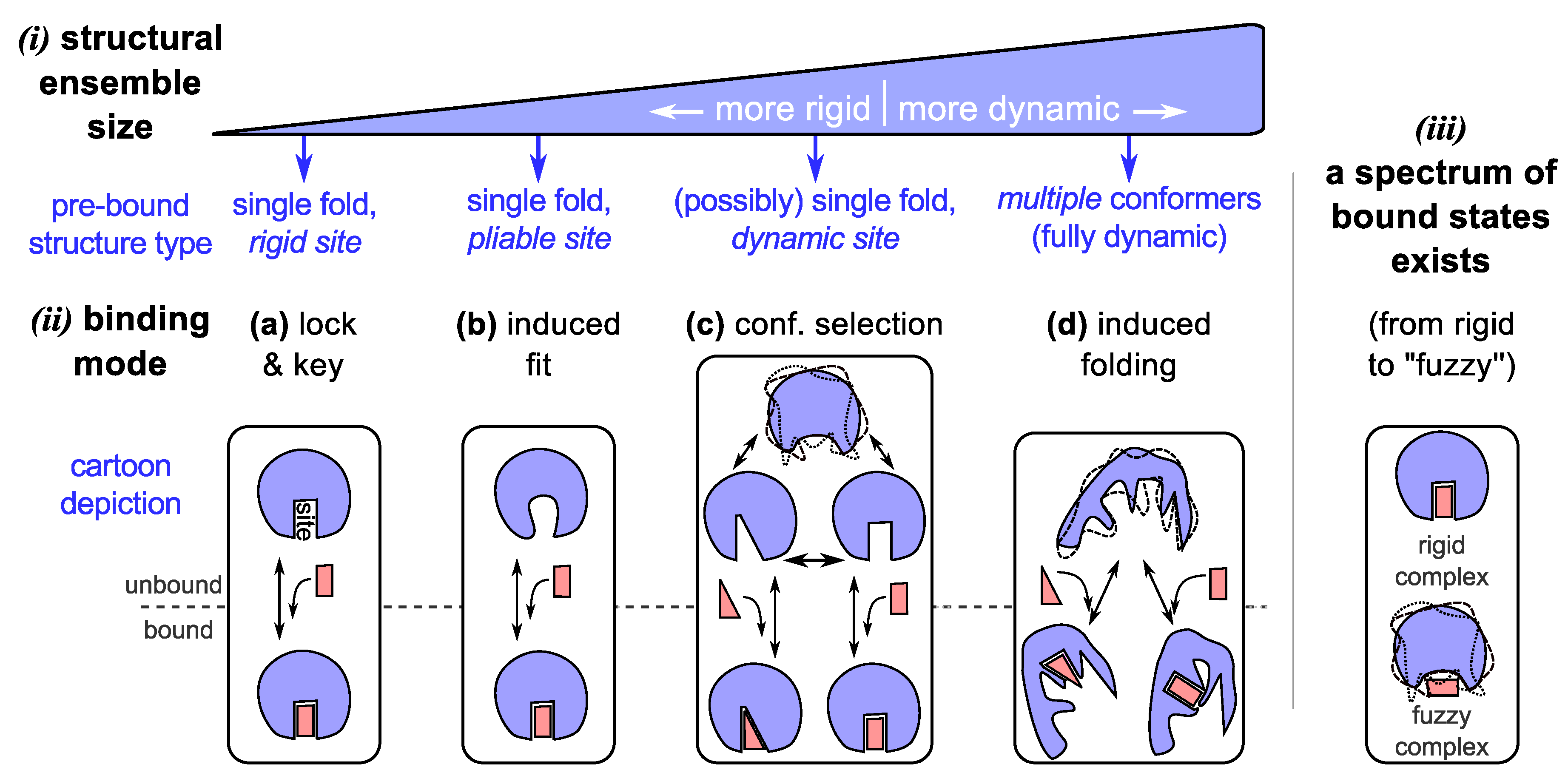 Both models of protein binding (Figure 1) require the existence of a specific fold that either binds to its partner without a fuss (lock and key) or with some convincing (induced fit). This relationship between folded conformation and function (via binding) [2,3] underlies the substantial efforts invested in elucidating conformations via experiment [36] and theory [37]. It is certainly the case that these atomistically-resolved folded conformations have assisted in uncovering a trove of functional and evolutionary understandings [36], while also validating [34,38] the two traditional models of binding. The connection to a folded, structured protein, however, is also the reason that these two models fall short in explaining the binding modes of dynamic proteins, discussed next.