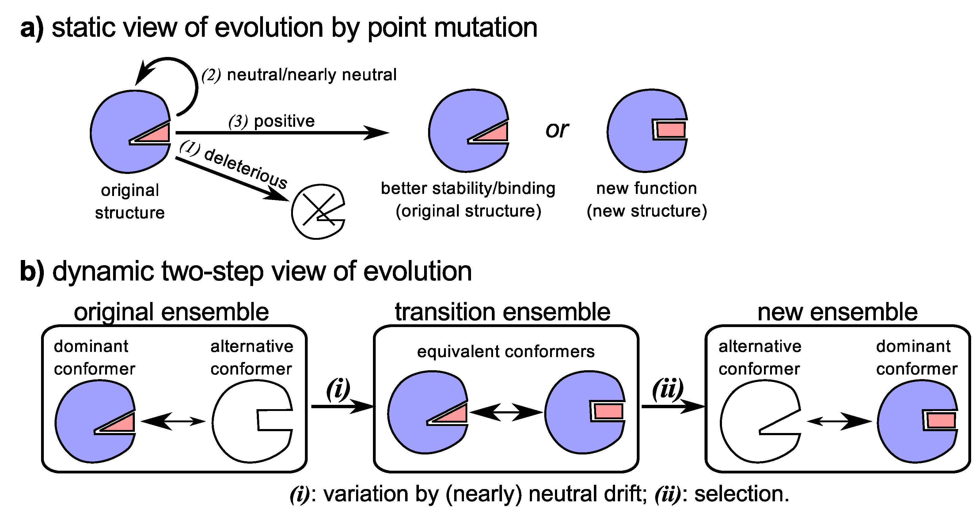 Finally, the historically warring [130] sects of sequence evolution—“neutral” and “adaptive” evolution—are married together as two crucial and inalienable components of the same process (reviewed in [25]): (1) the accumulation of neutral or nearly neutral mutations allowing for greater structural variability (Figure 3b-(i)); and (2) the happenstance recruitment of an alternative conformation to perform an alternative function (Figure 3b-(ii)). Combining both neutral and adaptive mutations in the evolution of novel functionality (along with with processes like gene duplication), the troubling “chicken-egg” puzzle of how structure must match an unmet function is quelled, since the structure was already present in residual amount.