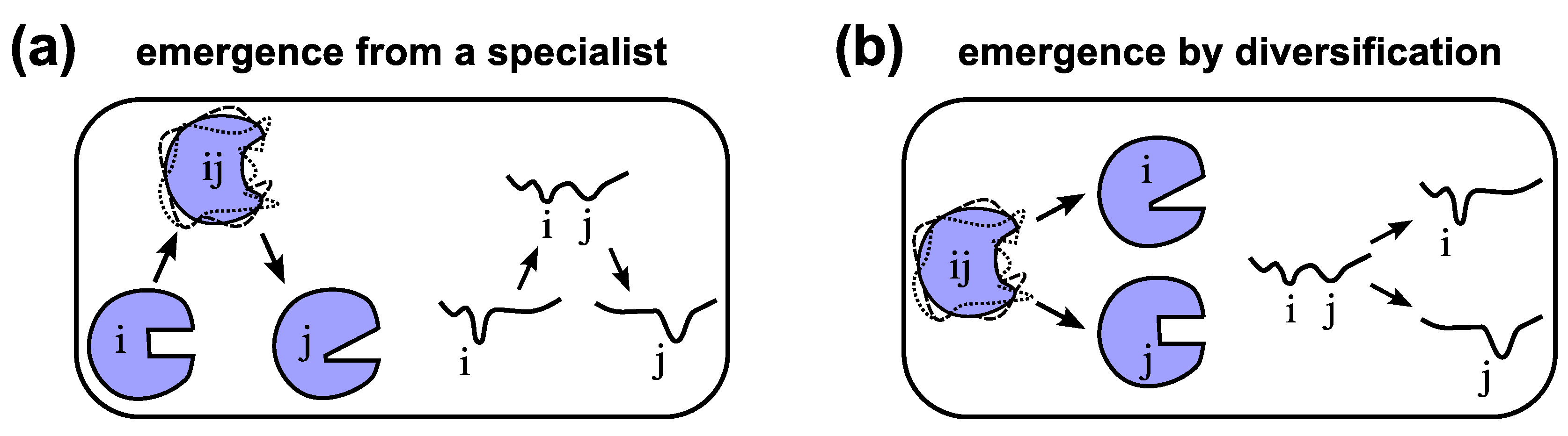 The evolution of one specialized functional protein from another through a promiscuous intermediate (Figure 4a) indicates a “serialness” to the process that may not exist in all situations. A particularly interesting hypothesis proposed by Jensen in 1976 [145] turns this scenario on its side (Figure 4b): assuming that ancient organisms have smaller genomes and protein repertoires [146], these proteins with less specialized and potentially ambiguous functionality could diversify into a number of specialized enzymes, with the help of gene duplication and sequence evolution [13,145]. This mode of evolution also called the “differential narrowing of substrate specificities” [147] or differentiation, is expected to lead to proteins of diverse families and superfamilies today [147,148,149]. Both the serial (Figure 4a) and divergent (Figure 4b) modes of protein evolution are models of protein evolution that require the existence of a fully functioning parent protein [145,147]. At one point in evolution, however, proteins would have had to originate from random peptides.