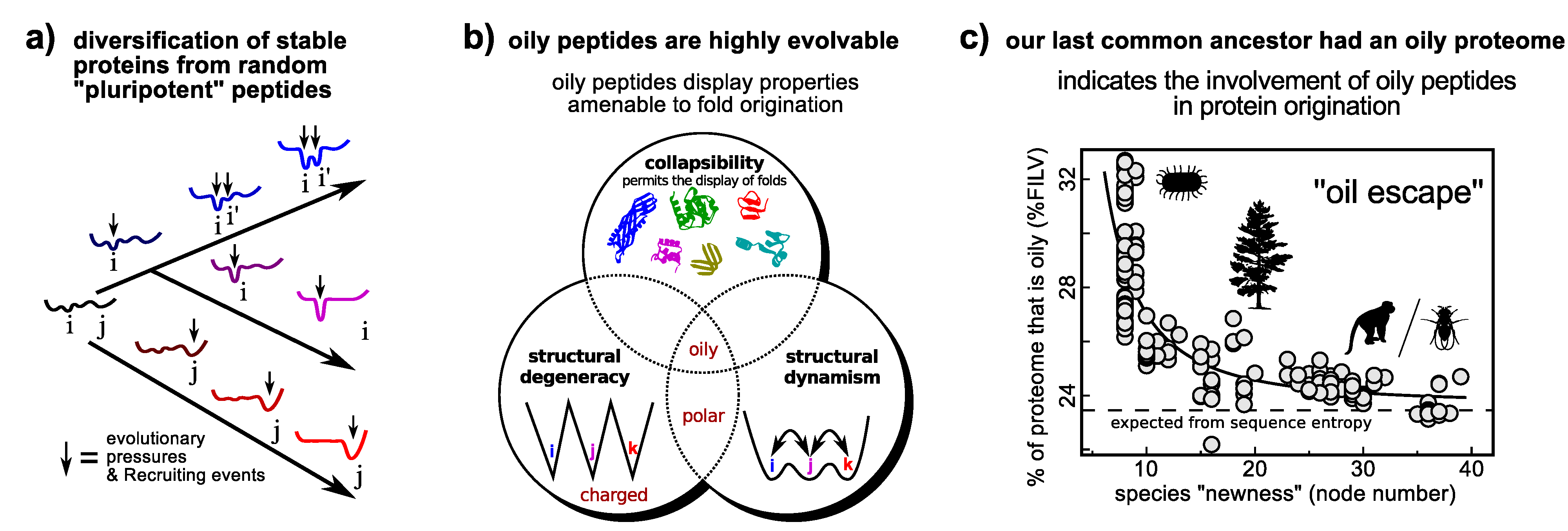 The interesting part of the hypothesis is that oily peptides (those described as having high %FILV [160]) indeed possess all of the properties (e.g., foldedness and dynamism; Figure 5b) important for protein fold origination [160], thereby allowing for simulation [160] and bioinformatics [161] to test the hypothesis. The following recent findings are in agreement to the pluripotent hypothesis: (1) oily peptides are, indeed, superior substrates for directed evolution to “evolvable” folds [159]; and (2) bioinformatics on whole proteomes [161] indicates that the last common ancestor’s proteomes had higher than average oil content (Figure 5c).