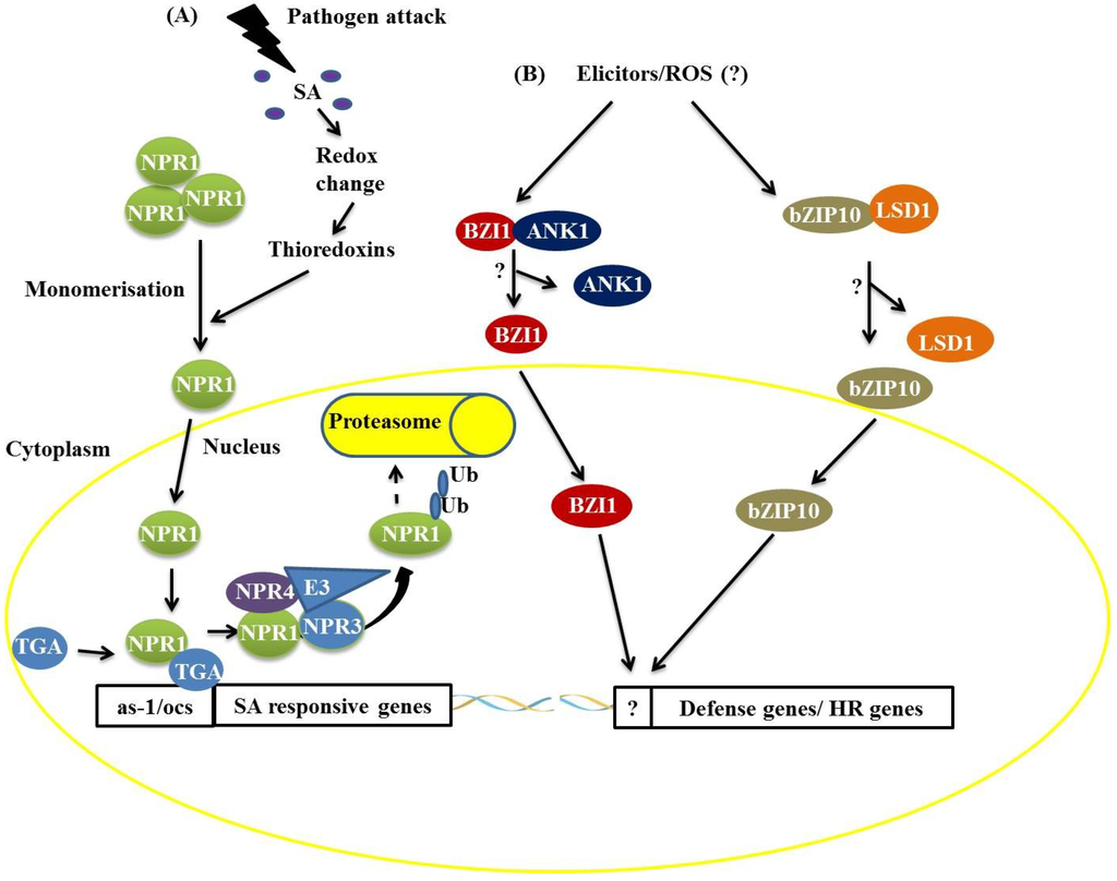 Two distinct mechanisms of basic leucine zipper containing domain proteins (bZIP) protein actions during plant defense responses. (A) The attack of a biotrophic pathogen triggers a signaling pathway mediated by salicylic acid resulting in the dissociation of the non-expresser of pathogen-related (PR) (NPR1) protein, which translocates to the nucleus and activates the expression of SA-responsive genes by interaction with the TGACGTCA cis-element-binding protein (TGA) bZIP trans-acting factors. The NPR1 protein is ubiquitinated and targeted for degradation by the 26S proteasome complex; (B) Recognition of elicitors after pathogen attack promotes the dissociation of the BZI1/ANK1 and AtbZIP10/LSD1 complexes, favoring the positive transcriptional regulation of hypersensitive response (HR)- and basal defense-related genes.