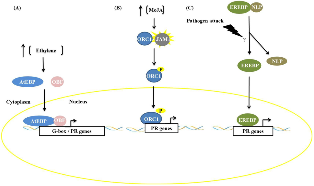 Types of interactions among APETALA2/ETHYLENE-RESPONSIVE ELEMENT BINDING FACTORS (AP2/ERF) factors and other proteins in response to biotic stress. (A) Association with other transcription factors: the protein AtEBP binds to OCTOPINE SYNTHASE (ocs) ELEMENTS BINDING FACTOR (OBF) protein, which is a bZIP protein, resulting in increased transcription of PR genes; (B) Phosphorylation: the AP2/ERF factor octadecanoid-responsive-Catharanthus-APETALA2-domain protein (ORC1) is phosphorylated by kinase JAM1 and promotes expression of genes related to nicotine synthesis; (C) Dissociation: after ethylene induction or pathogen infection, the protein EREBP dissociates from NLP protein. This dissociation results in the translocation of EREBP to the nucleus and leads to expression of PR genes.