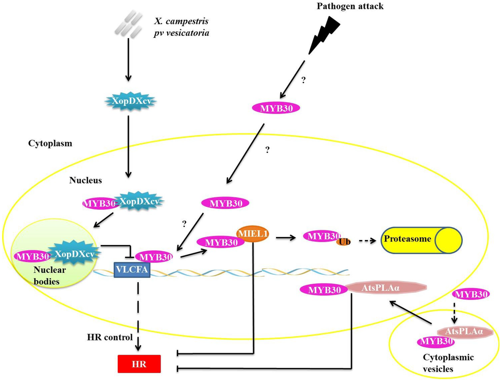 Repression mechanisms of myeloblastosis related proteins (MYB)30 function during pathogen attack. XopDXcv interacts with MYB30 in plant cell nucleus, retaining MYB30 in nuclear bodies and preventing the transcription of the very long chain fatty acid biosynthesis genes (VLCFA) genes. Ubiquitin ligase E3 MYB30-INTERACTING E3 LIGASE1 (E3 MIEL1) interacts with MYB30 in the nucleus and promotes its ubiquitination and consequent degradation by the 26S proteasome complex (UPS26). AtsPLAα binds with MYB30 and they translocate from the cytoplasmic vesicles into the nucleus, but the interaction of AtsPLAα with target DNA is prevented.