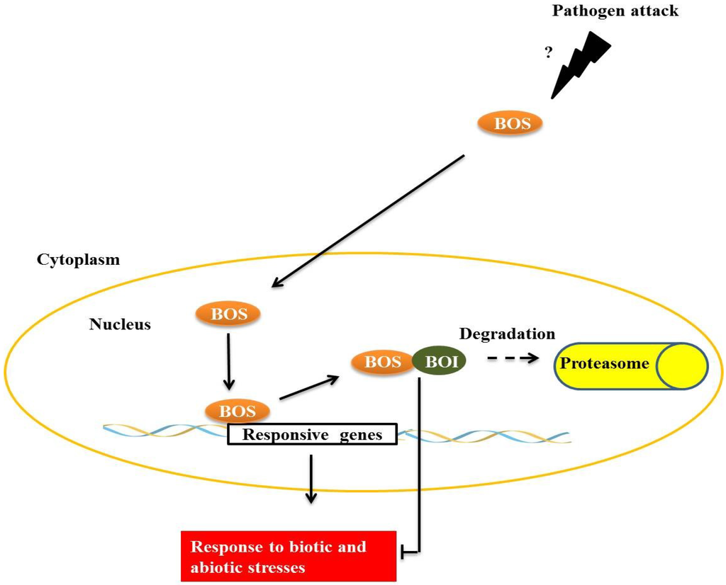 The transcription factor, BOTRYTIS SUSCEPTIBLE (BOS), interacts with E3 BOTRYTIS SUSCEPTIBLE1 INTERACTOR (BOI) in the plant cell nucleus. E3 BOI promotes BOS ubiquitination and the consequent degradation by the 26S proteasome complex, restricting the biotic and abiotic stress responses mediated by BOS.