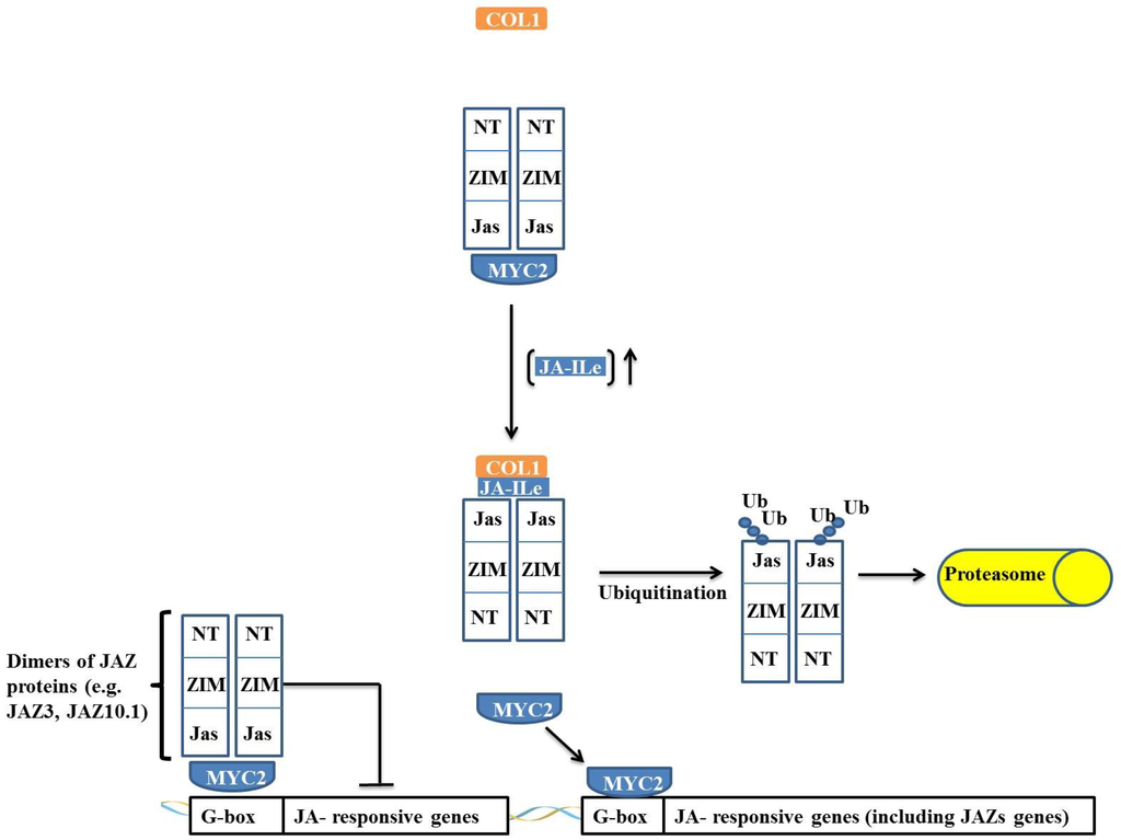Regulation of jasmonate-responsive gene expression by MYC2 and JAZ proteins. In absence of JA-Ileu, JAZ protein interacts through its N-terminal domain with MYC2, causing the transcription factor to remain inactive. When the JA-Ileu level increases, JA-Ileu binds to Jas domain of JAZ protein and promotes interaction of JAZ protein with COI1 leading to the formation of the SCFCOI1 complex. The SCFCOI1 complex causes ubiquitination of JAZ protein in its Jas domain and the protein is degraded by the 26S proteasome complex. MYC2 is released and promotes transcription of target genes.