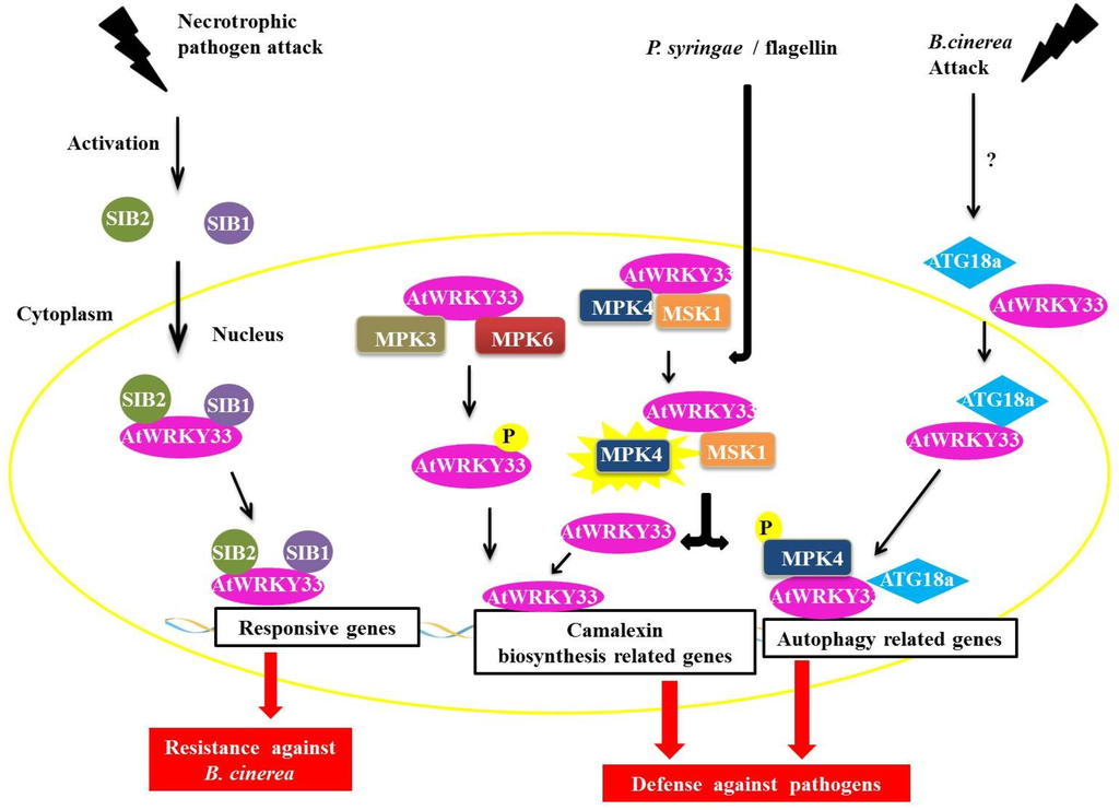 Overview of AtWRKY33 interactions during biotic stress responses. During an attack by a necrotrophic pathogen, AtWRKY33 interacts with the proteins SIGMA FACTOR-INTERACTING PROTEIN 1 (SIB1) and SIGMA FACTOR-INTERACTING PROTEIN 2 (SIB2) in the nucleus. These interaction leads to transcription of genes responsive to the pathogen, causing an increased resistance in the plant (in this case against B. cinerea, a necrotrophic fungus). In a second interaction, AtWRKY33 can be phosphorylated by two MITOGEN-ACTIVATED PROTEIN (MAP) kinases, MITOGEN-ACTIVATED PROTEIN KINASE 3 (MPK3) and MPK6. This interaction leads to an increase in the transcription of related genes of camalexin biosynthesis, which is an important pathway utilized by the plant defense against pathogens. Another interaction leads to increased transcription of camalexin related genes. After induction by Pseudomonas syringae or flagellin, the protein MPK4 is activated and phosphorylates its substrate, the MAP KINASE SUBSTRATE1 (MSK1) protein. Phosphorylation of MSK1 releases AtWRKY33 of protein complex allowing the protein to exert its role as a transcriptional activator of plant defense genes. Finally, during attack of fungus B. cinerea, AtWRKY33 interacts with ATG18a in the nucleus. ATG18a is an important protein of the autophagy pathway in Arabidopsis, and its interaction with AtWRKY33 along with the activation of the autophagy pathway is important for signaling the response of plant defense against necrotrophic pathogens.