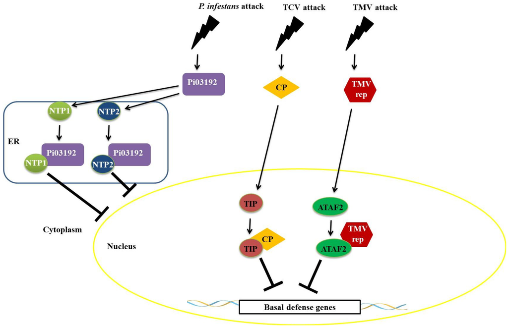 Repression mechanisms of NAC transcription factors mediated by proteins of pathogens. The effector LxLR (Pi03192) of Phytophthora infestans interacts with two transcription factors from the no apical meristem (NAM), Arabidopsis transcription activation factor (ATAF), and cup-shaped cotyledon (CUC) (NAC) family (NAC TARGETED BY PHYTOPHTHORA 1 and 2 (NTP1 and NTP2)) in the endoplasmic reticulum, thus preventing the localization of these factors to the nucleus. The viral capsid protein from the turnip crinkle virus (TCV) virus binds to TCV-INTERACTING PROTEIN (TIP) factor, repressing the expression of defense genes, favoring systemic infection by plant viruses. The helicase domain of the Tobacco mosaic virus (TMV) virus replicase interacts with Arabidopsis transcription activation factor 2 (ATAF2)-suppressing plant defenses.