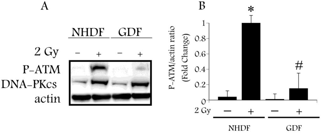 Western blot analysis of ATM activation by 2 Gy X-ray in Gorlin syndrome patients (GDFs) compared with normal human dermal fibroblasts (NHDFs). Panel A: Western blot showing anti-phospho-ATM antibody (P-ATM) and DNA-PKcs protein levels following exposure of NHDFs and GDFs to 2 Gy X-radiation at 10 min post-exposure; Panel B: Quantification of western blot results. Graph represents the pooled results from two separate experiments performed in duplicate (pooled results, n = 4) with values expressed as the mean ± SE. * Significantly different from NHDF sham control, p < 0.05. # Significantly different from 2 Gy NHDF group, p < 0.05.
