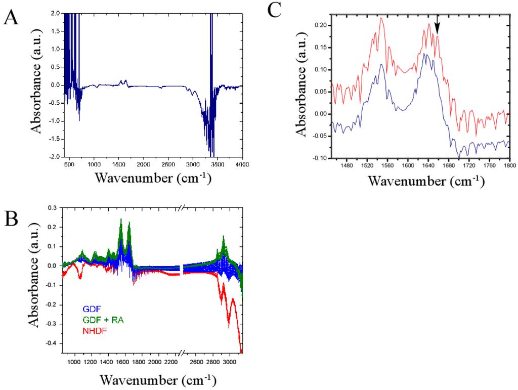 We investigated whether a newly developed omics technology (termed the IncubATR) had sufficient sensitivity to discriminate bulk chemical bond patterns in live cell studies comparing (1) NHDFs vs. GDFs and (2) GDFs vs. GDFs + retinoic acid as described in Methods. To illustrate how data are processed, Figure 5A shows the raw spectrum for NHDFs. Figure 5C illustrates a magnified view of the spectral region containing Amide bands I and II to show the spectral fingerprints for NHDFs (red) and GDFs (blue) in greater detail. Observable peaks are qualitatively very similar between experimental groups, indicating that many of the spectral features detected are conserved (i.e., fibroblasts from 2 different donors showed high similarity). However, differences in the presence or absence of some peaks were noted (see arrow as one example). In the example highlighted by the arrow, the indicated band correlates to membrane-associated helical proteins based on infrared spectroscopy correlation tables. Whether this assignment is true for bulk chemical bond patterns in live cells has yet to be determined. We subsequently used principle component analysis to determine whether sufficient differences were present to discriminate between experimental groups.