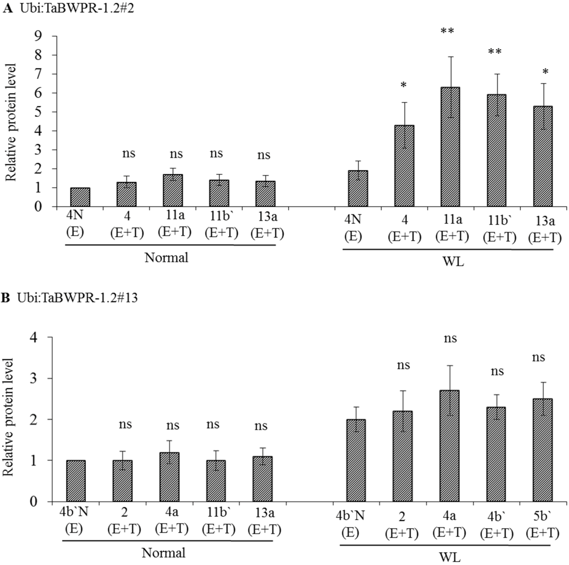 The levels of TaBWPR-1.2 proteins in the roots of homozygous transformants under control conditions and five days of waterlogging (WL). Immunoblotting was performed with anti-rice PR-1 antibody. (A) Four transgenic TaBWPR-1.2#2 lines; (B) four transgenic TaBWPR-1.2#13 lines. E, endogenous proteins; T, transgene proteins. The data are the means of three independent biological samples; error bars represent ±SEM. ns, not significant; * p < 0.05; ** p < 0.01 by a two-sample t-test.