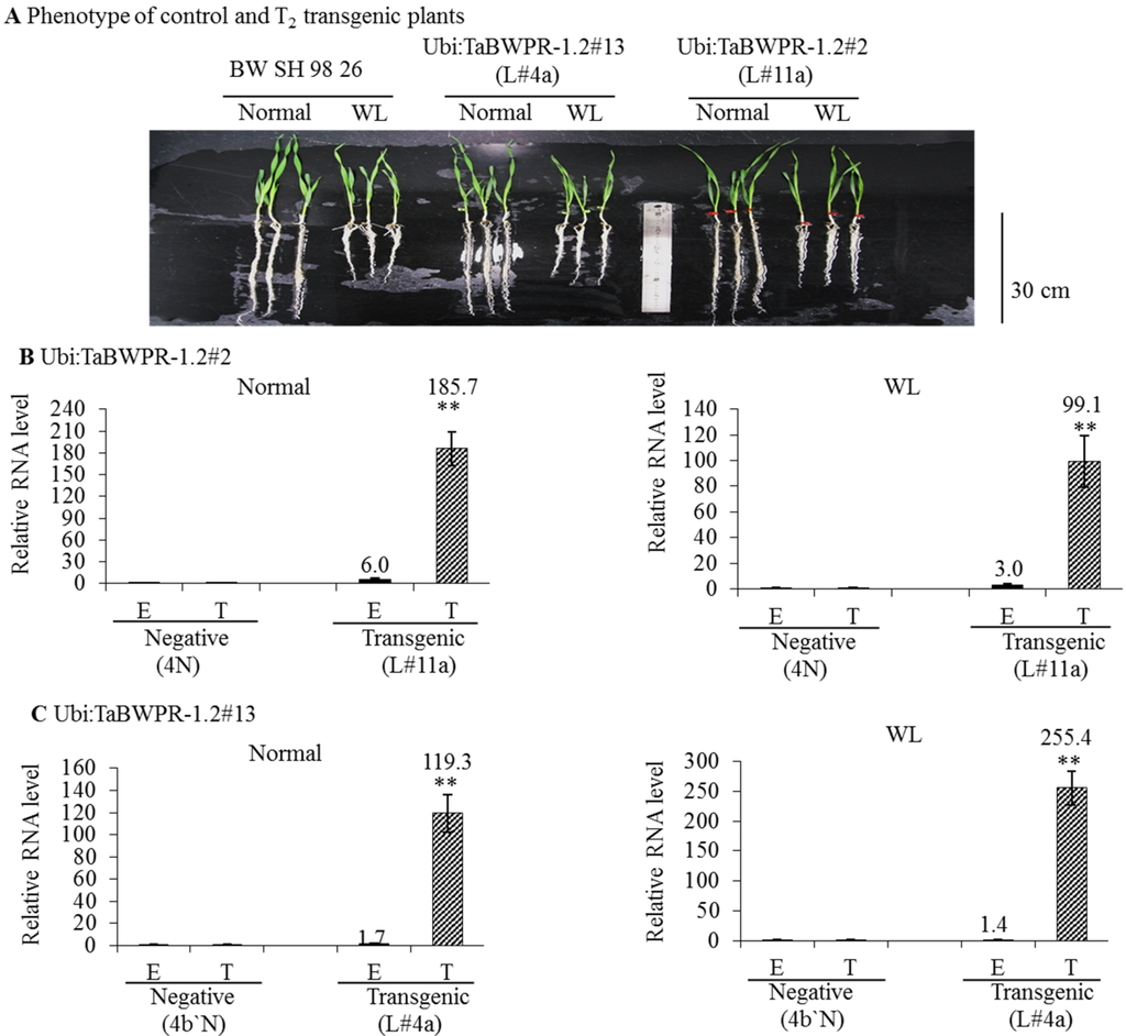 We produced homozygous transgenic Ubi:TaBWPR-1.2 wheat and examined the RNA and proteins of seminal roots responsive to transgenes overexpression under normal and WL conditions. To the best of our knowledge, this is the first report of successful wheat transformation with TaBWPR-1.2 constructs. Our transgenic TaBWPR-1.2#2 line stably produced the RNA and protein of interest.