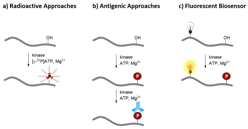 Strategies for Probing and Studying Protein Kinases in vitro and in cellulo. Several strategies have been developed to study the function/activity of protein kinases. (a) Radioactive endpoint assays rely on incorporation of radioactive phosphate into a substrate by the kinase; (b) Antigenic approaches report on phosphorylated epitopes thanks to highly specific antibodies; (c) Fluorescent biosensors report on phosphorylation by protein kinases through sensitive changes in fluorescence.