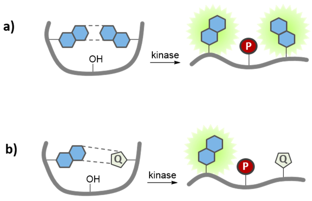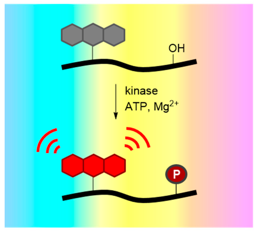 Equally important, several families of non-genetic kinase biosensors have been engineered through incorporation or conjugation of synthetic fluorescent dyes to peptide or protein backbones. Phosphorylation by an active kinase will affect the spectral properties of the dye either directly or indirectly. Depending on the design of the biosensor and the nature of the dye, the photophysical mechanism of response will be different, such as fluorescence enhancement, or solvatochromic shifts. These systems are more readily applicable in vitro but can be microinjected or introduced into living cells through facilitated delivery and have proven equally sensitive and successful to genetically-encoded kinase biosensors for monitoring protein kinase activities [17,18,19,20,21].