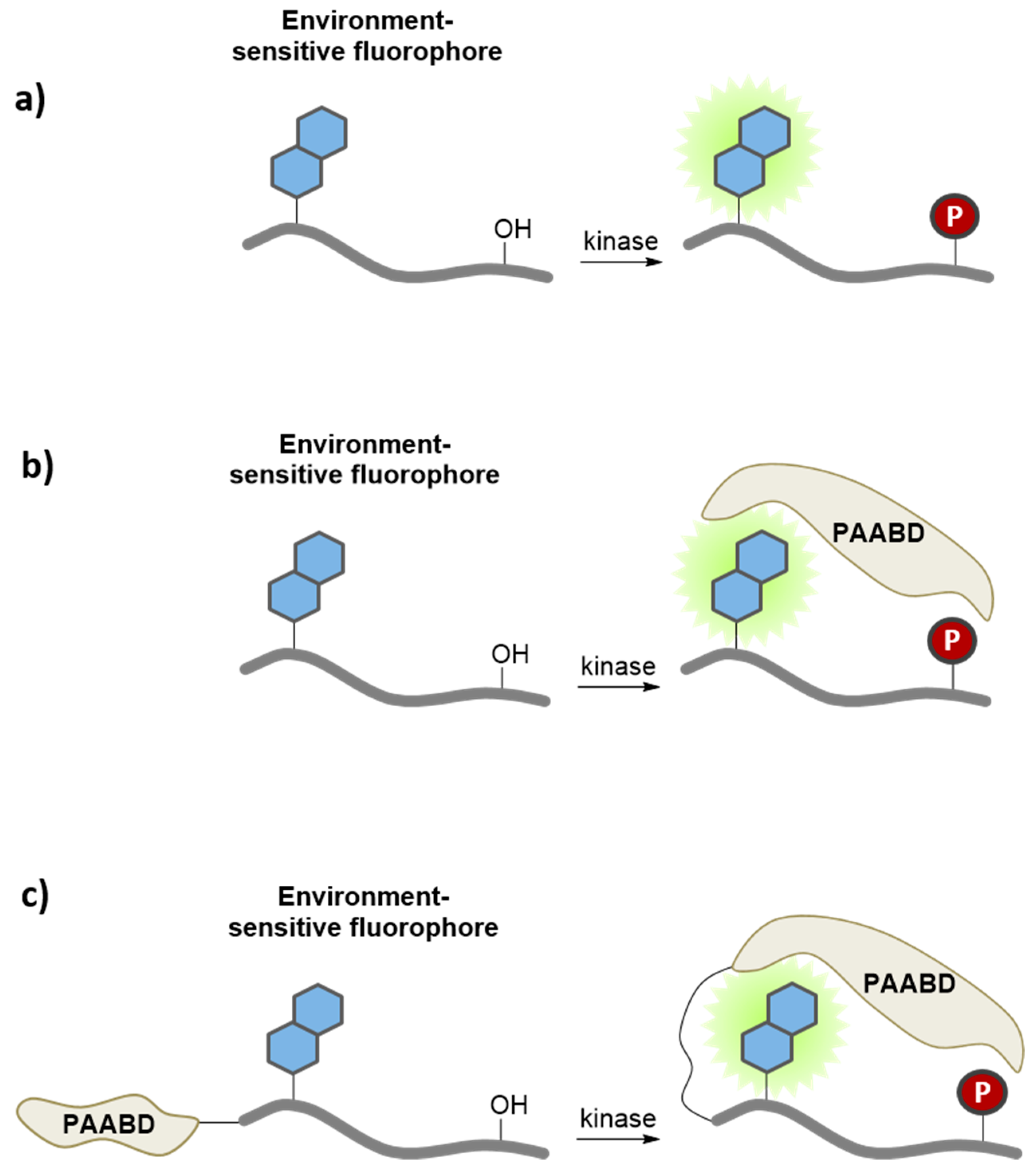 Environment-sensitive kinase biosensors. Environment-sensitive kinase biosensors are composed of a peptide sequence derived from a substrate and a fluorophore that is conjugated immediately adjacent or proximal to (i.e., 2–5 residues away) the phosphorylation site. Phosphorylation modifies the local environment of the solvatochromic fluorophore, promoting (a) direct changes in its fluorescence emission; (b) indirect changes in fluorescence, following intermolecular interaction with a phospho amino acid binding domain (PAABD); or (c) intramolecular interaction when the PAABD is fused/conjugated to the substrate domain.