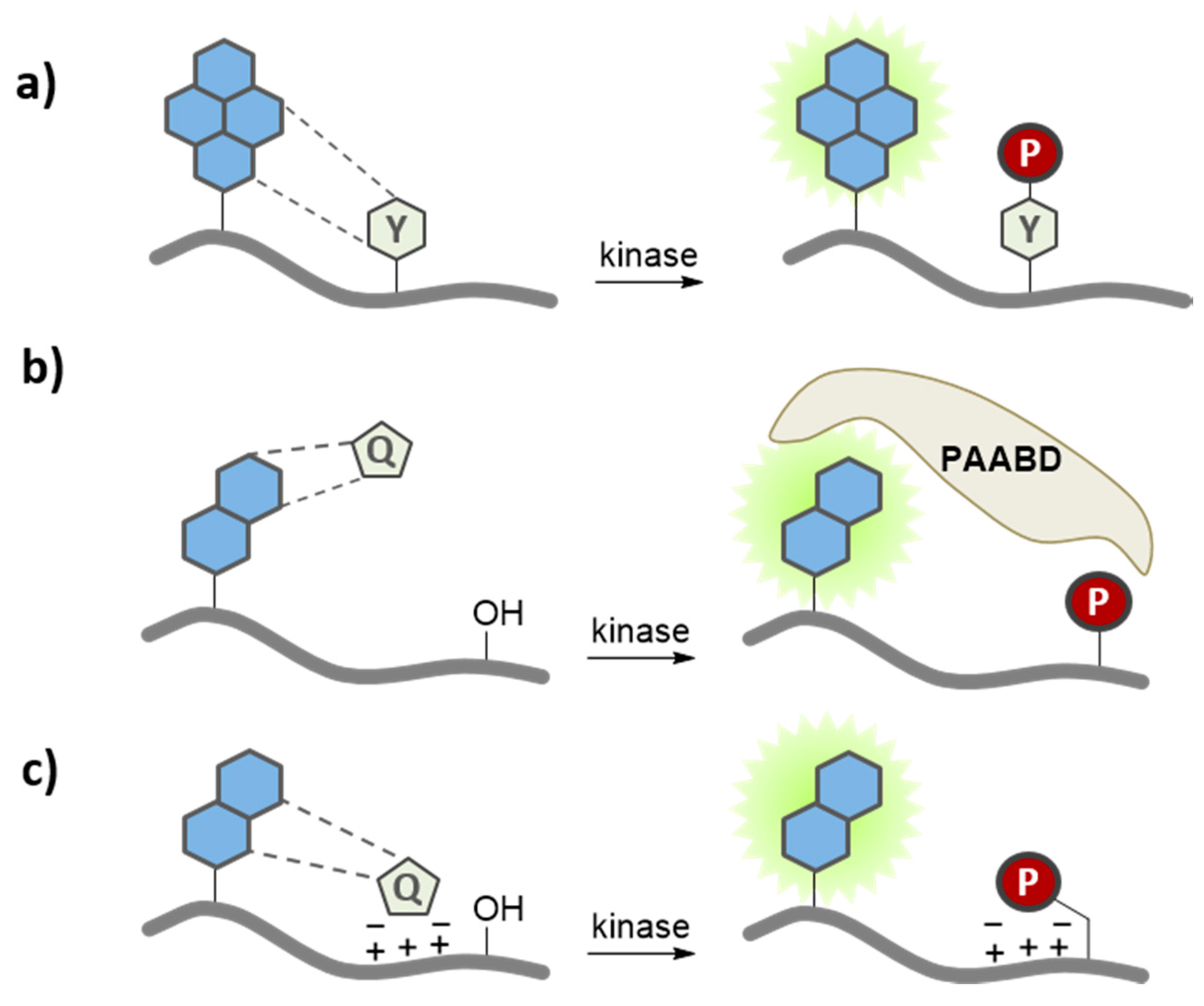 Quenching-based kinase biosensors. These biosensors exhibit differential fluorescence following phosphorylation due to, (a) disruption of intramolecular quenching of the fluorescent probe conjugated to a positively charged (+) substrate domain with a tyrosine residue (Y); (b) displacement of a soluble quencher (Q) by a PAABD that binds the phosphorylated substrate; or (c) displacement of a negatively charged quencher (−) due to charge repulsion upon phosphorylation (−).