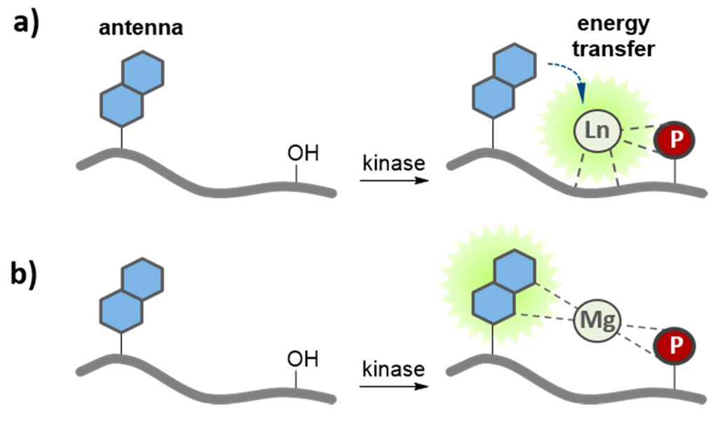 Several strategies that rely on metal ion-mediated luminescence or fluorescence to sense phosphorylation have been described. In the unphosphorylated state, these biosensors exhibit poor metal ion affinity and are essentially non-fluorescent. However, incorporation of a phosphate group provides two essential ligands, resulting in a significant increase in the avidity for binding to hard metal ions, such as magnesium or lanthanide ions, and a subsequent positive signal. Several peptide biosensors have been devised to bind lanthanide ions such as Tb3+ or Eu3+ [54,66,67]. In these cases, the mandatory nearby antenna (Trp or carbostyril) absorbs light and sensitizes the corresponding lanthanide, which produces long-lived luminescence to sense kinase activity (Figure 6a). Upon phosphorylation, these biosensors display up to 10-fold increase in luminescence. Unfortunately this strategy is mainly restricted to in vitro conditions due to the requirement of the free cell-toxic lanthanide ions.