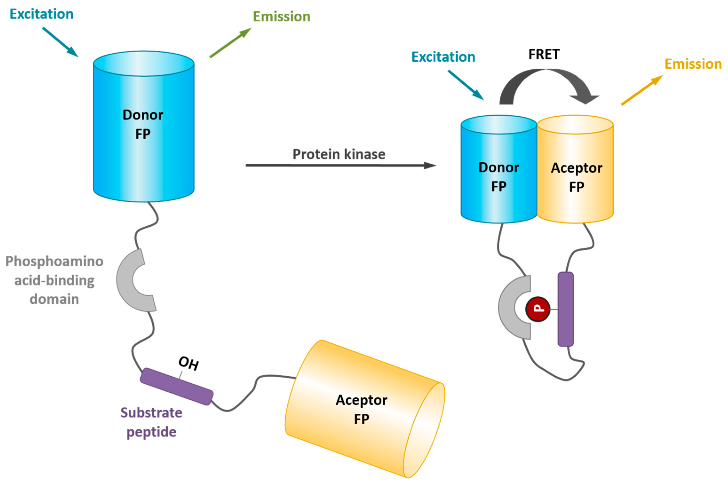Genetically-encoded protein kinase biosensors are single-chain FRET biosensors, also known as Kinase Activity Reporters (KARs), that express a pair of genetically-encoded autofluorescent proteins (AFPs) flanking a substrate sequence and a phosphoamino acid-binding domain (PAABD) joined by a linker. In the presence of active kinase which phosphorylates the substrate sequence of the biosensor, the PAABD is prompted to bind the phosphorylated substrate, thereby bringing the AFPs in close proximity. This intramolecular conformational change favors fluorescence resonance energy transfer between the donor and the acceptor, which results in an increase in fluorescence intensity and lifetime of the acceptor, and a concomitant decrease in the fluorescence intensity and lifetime of the donor (Figure 7). Several successful examples of KARs have been reported, allowing monitoring oscillations in kinase activity throughout the cell division cycle, or in specific signaling pathways with high spatial and temporal resolution. These biosensors and their properties are summarized in Table 2 and reviewed in detail in Ref. [21].
