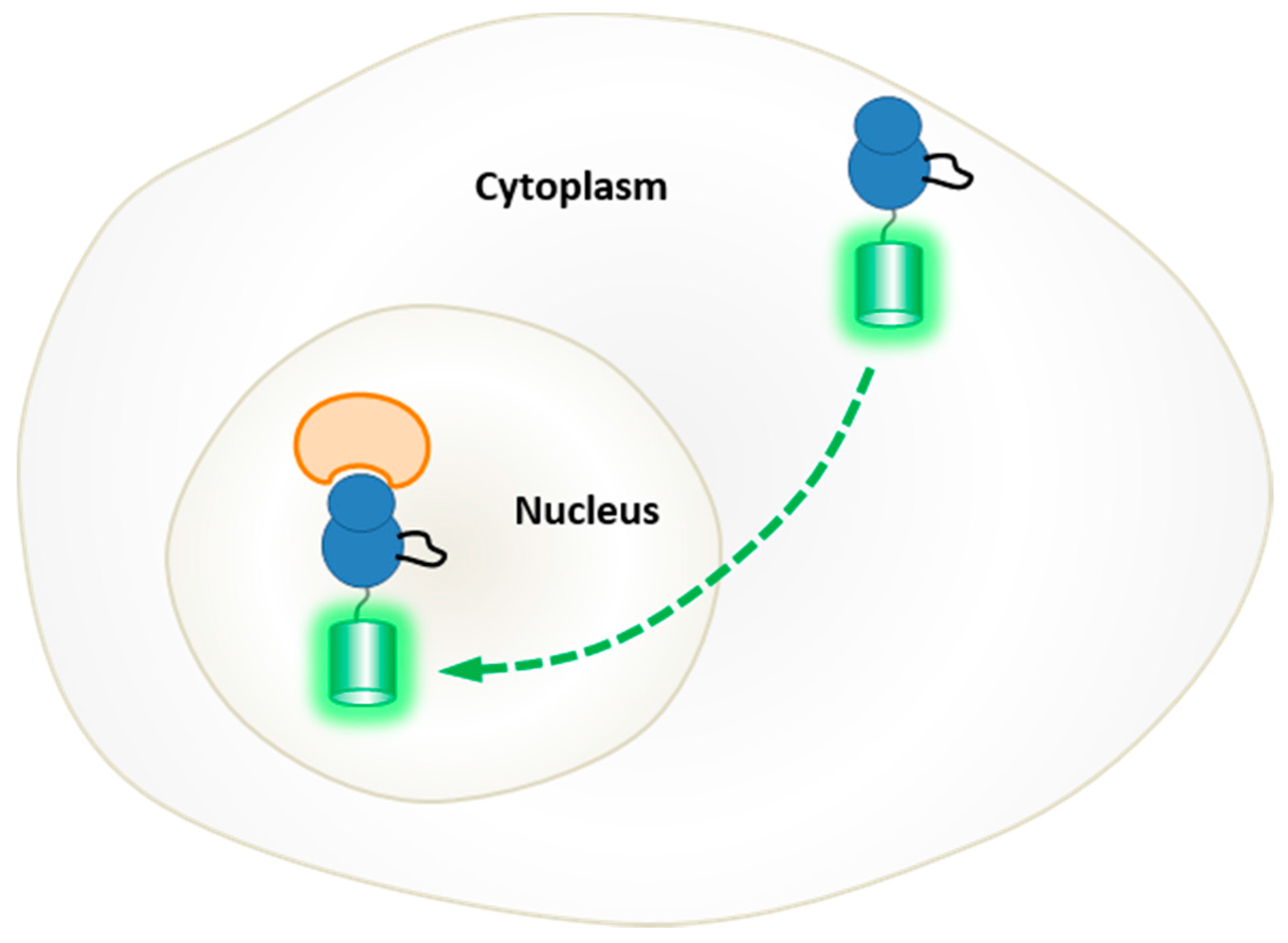 Besides microinjection, electroporation or cell-loading approaches which apply mechanical stress on the cell membrane [71], transduction of peptide and protein biosensors into living cells can be achieved thanks to peptide-based carriers such as protein-transduction domains or cell-penetrating peptides, which are either covalently fused (e.g., TAT), conjugated or complexed into non-covalent nanoparticles [72,73,74,75]. In addition lipid-based formulations, cationic and polymeric carriers, as well as silica-based nanoparticles or carbon nanotubes offer plenty of platforms to ensure delivery of peptide and protein biosensors into cells [76,77,78].