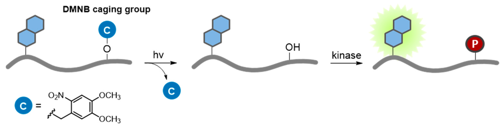 | Probe proximal to phosphorylation site, caged serine | NBD | PKC | In cellulo to monitor PKC activity in HeLa cells following microinjection and selective photoactivation | [55] |
