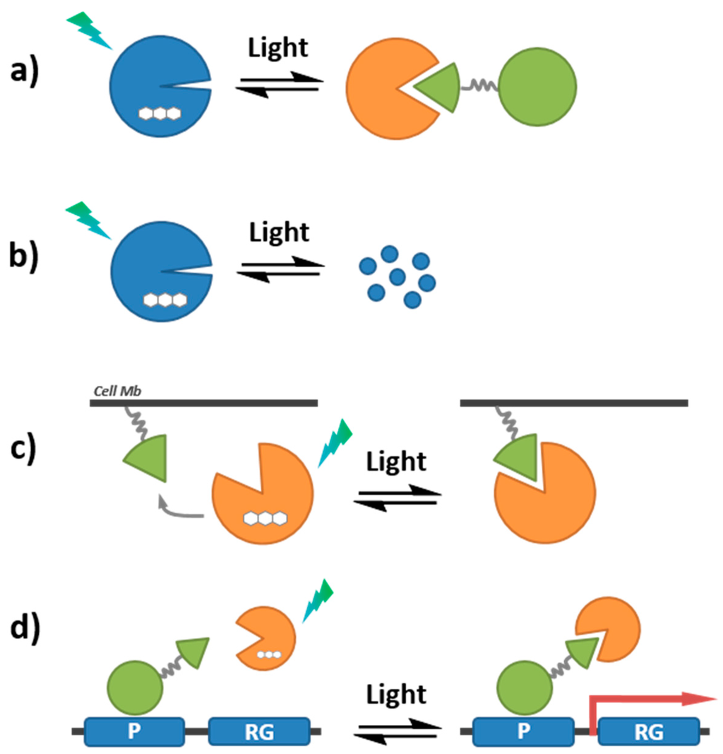 - Pathak, G.P.; Vrana, J.D.; Tucker, C.L. Optogenetic control of cell function using engineered photoreceptors. Biol. Cell 2013, 105, 59–72. [Google Scholar] [CrossRef] [PubMed]