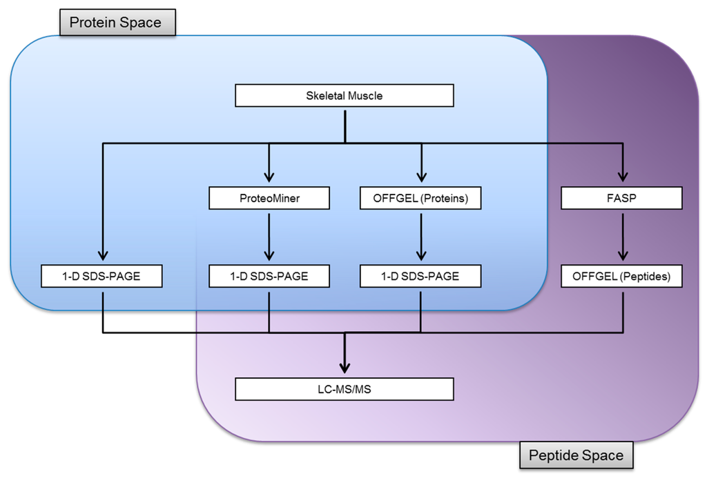 A multiplexed approach to characterising the skeletal muscle proteome skeletal muscle from common carp was homogenized and subjected to a range of separation techniques prior to mass spectrometric analyses. The soluble protein fraction was either separated by 1-D SDS-PAGE or simplified by either ProteoMiner protein equalization or OFFGEL isoelectric focusing before the eluted fractions were analysed by 1-D SDS-PAGE. A further strategy analysed the whole protein homogenate by sampling directly in the peptide space. Proteins were digested in-solution prior to OFFGEL fractionation.